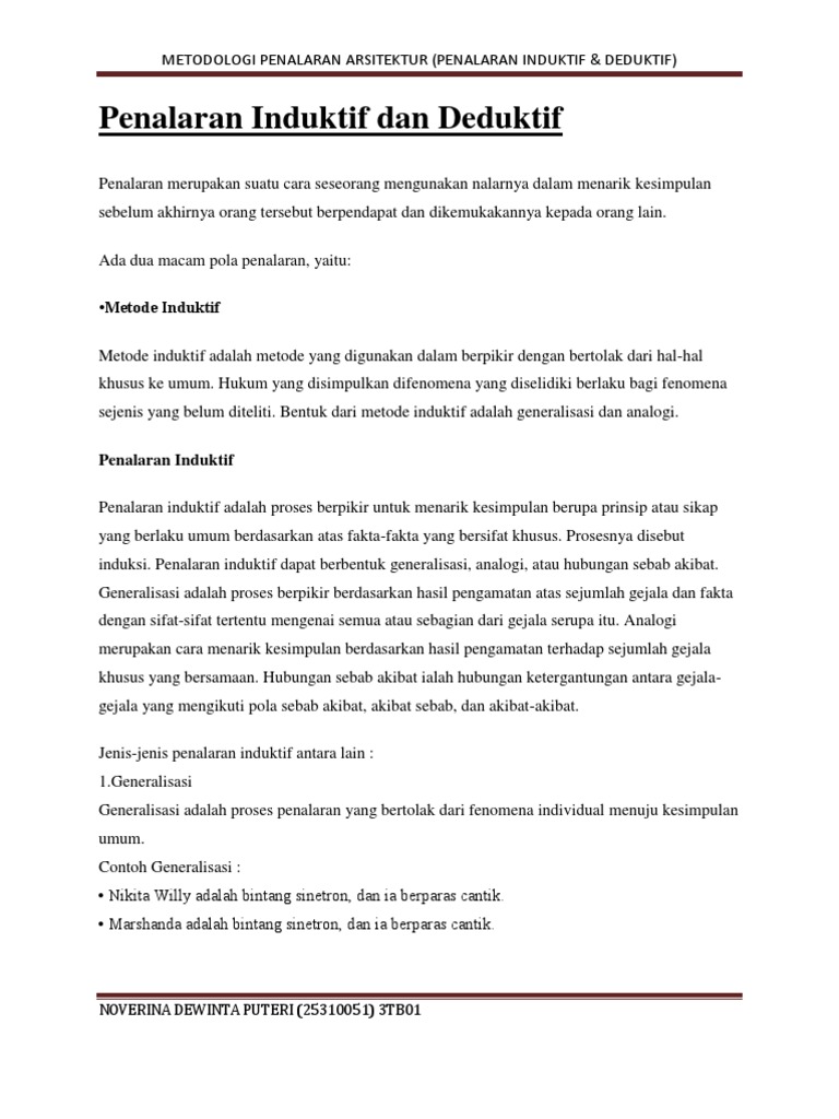 Penalaran induktif adalah suatu penalaran yang berpangkal dari peristiwa khusus sebagai hasil pengamatan empirik dan berakhir pada suatu kesimpulan atau pengetahuan baru yang bersifat umum. Itu metode induktif dan metode deduktif mereka adalah dua pendekatan yang berlawanan untuk penelitian. Tidak hanya contohnya saja yang. Penalaran deduktif dan induktif— transcript presentasi dari prosesnya, penalaran dapat dibedakan sebagai penalaran deduktif dan induktif. Dimana lebih lanjut penalaran deduktif terkait dengan rasionalisme dan penalaran induktif dengan empirisme.