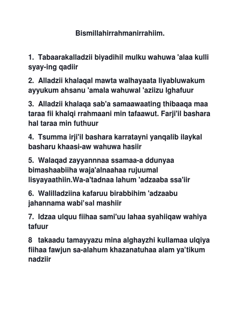 Jual Surat Yaasiin Burdah Art Paper Huruf Arab Latin Dan Terjemahannya Banjarmasin Buku Murah Banjarmasin Tokopedia from ecs7.tokopedia.net Surah ini tergolong surat makkiyah, terdiri atas 30. Listen surah mulk audio mp3 al quran on islamicfinder. Alladzii khalaqa almawta waalhayaata liyabluwakum ayyukum ahsanu 'amalan wahuwa al'aziizu alghafuuru. Surat al wakiah al mulk latin mp3 & mp4. Nama al mulk diambil dari kata al mulk yang terdapat pada ayat pertama surat ini yang artinya kerajaan atau kekuasaan. The surah emphasizes that no individual can impose his will on another; Keutamaan surat al mulk (baca juga keutamaan surat al waqi'ah) tersebut bisa diperoleh jika tekun dan rutin setiap hari terutama di waktu malam menjelang tidur. Baca surat al mulk lengkap bacaan arab, latin & terjemah indonesia.